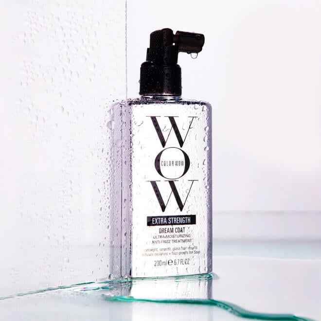 Control frizz, block out humidity, and achieve glass-like shine on hair with the Color Wow Dream Coat Extra Strength treatment. Featuring the same award-winning water resistant technology found in Color Wow Dream Coat Supernatural Spray, this styling spray delivers sleek, smooth, super frizz-resistant results that last up to 4 washes on dry, dehydrated or extra coily and curly hair. Dream Coat Extra Strength uses a heat-activated Polymer Technology that is ultra-light, scattering a superfine mist evenly on hair’s surface. When blow-dried with heat and tension, micro-dots of mist connect and cross link, forming a powerful, hydrophobic matrix that invisibly surrounds each hair strand, shielding it in a protective coating so water and humidity bounce right off. Hair is left incredibly soft, smooth and humidity resistant for days, even after washing. Unlike oils or serums, Dream Coat Extra Strength is feather-light, smoothing and moisturising without weighing hair down or leaving it greasy. Transform even the most frizzy, coily hair into supernaturally smooth, sleek locks with Color Wow Dream Coat Extra Strength.