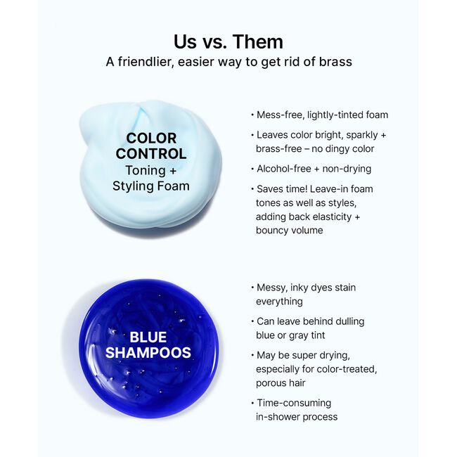 A leave-in styling foam to neutralise brassy, orange tones in brunette hair. Experience softer, easier to style hair with Color Control Toning & Styling Foam for Dark Hair by Color Wow.